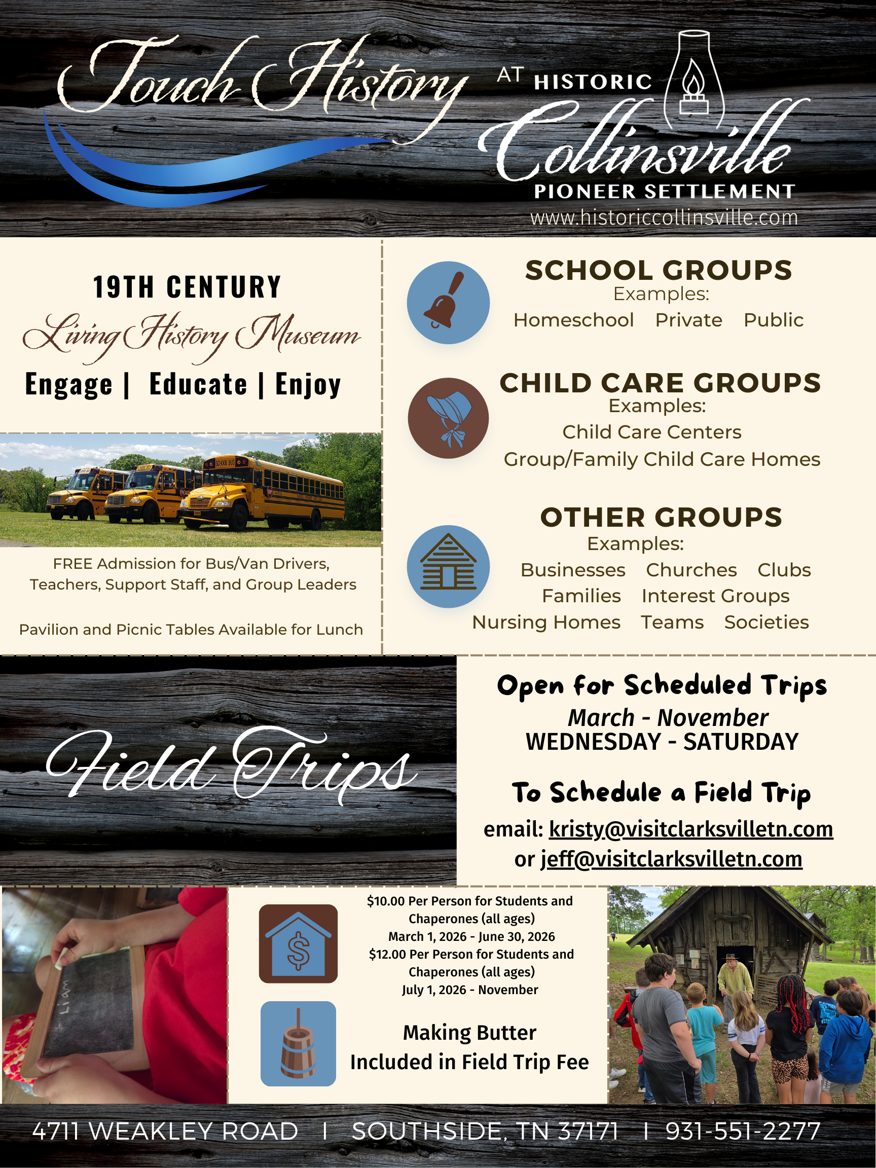 Historic Collinsville is open for scheduled trips Wednesday-Saturday, 9AM – 2PM.